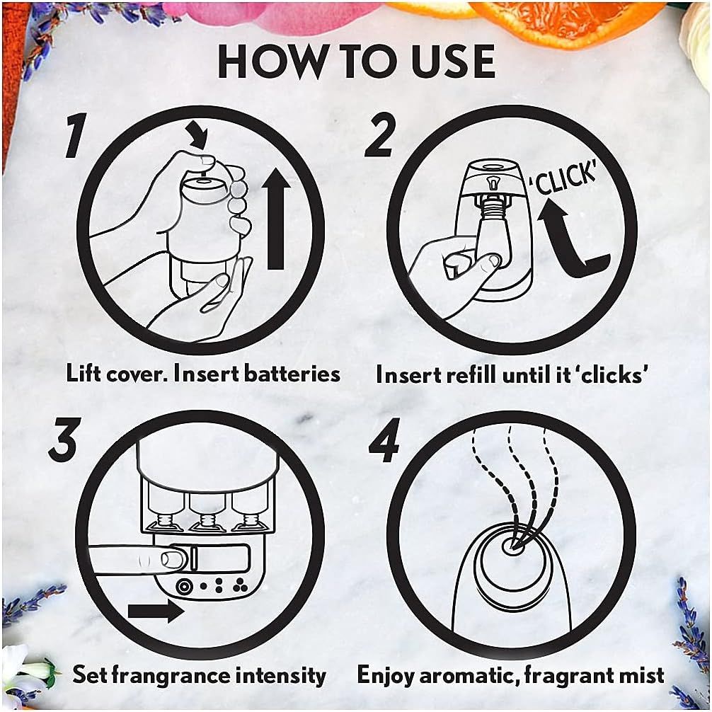 This ready-to-use kit includes everything you need for immediate use — one diffuser device, one fragrance refill, and three batteries.